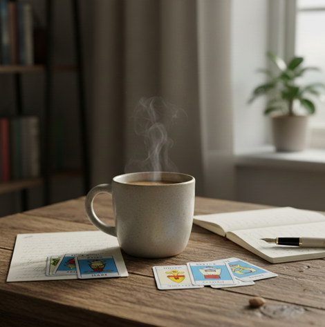 Viele Menschen trinken morgens erst einmal einen Kaffee oder Tee, um wach zu werden. Stell dir vor, du kombinierst das mit einer kleinen Kartenlegung. Du ziehst eine Karte, legst sie vor dich und fragst: „Was darf ich heute im Blick behalten?“